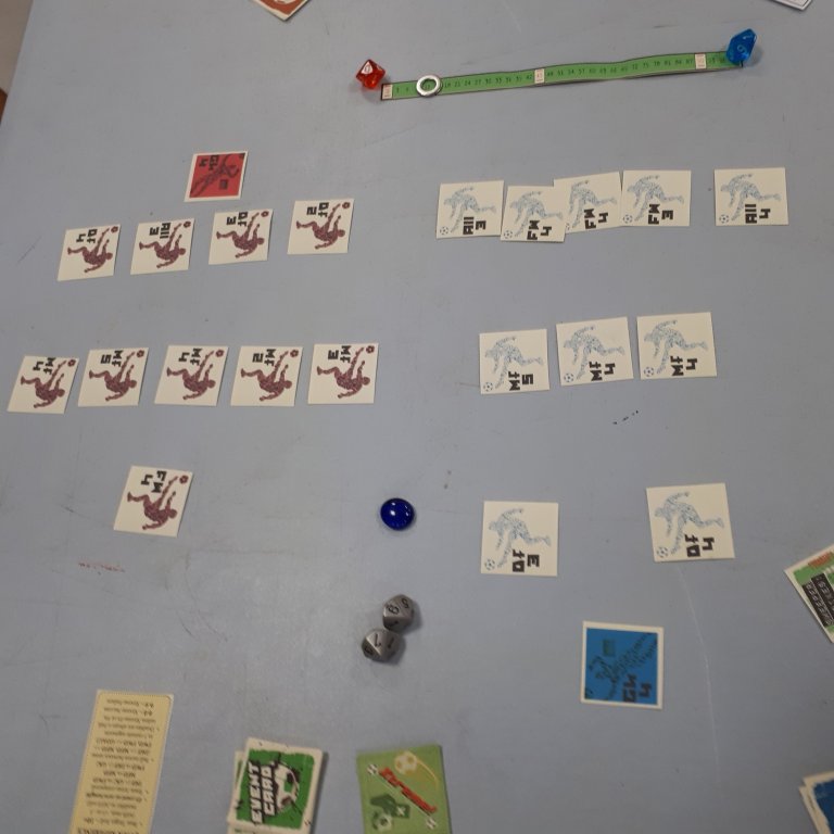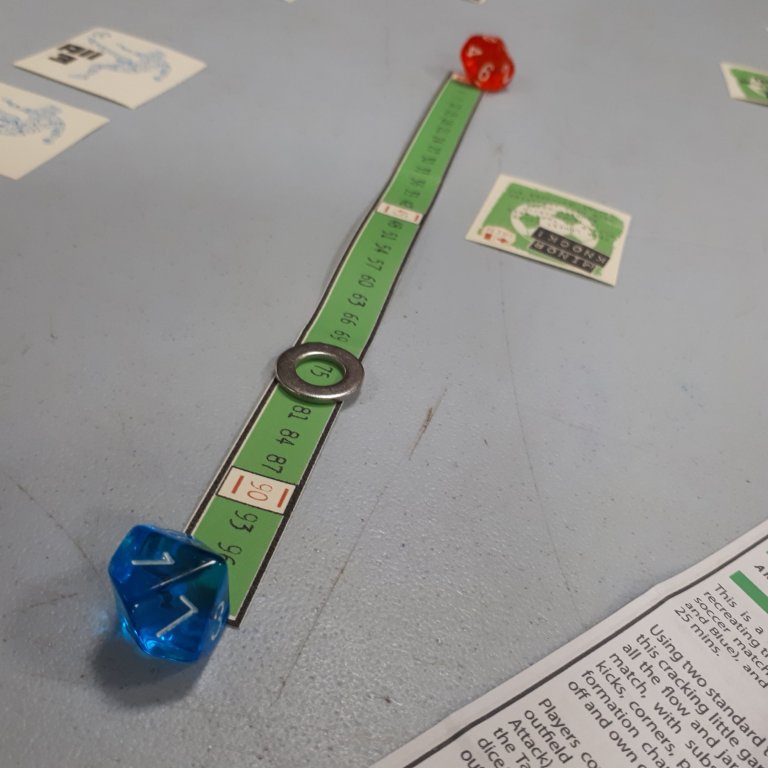 After this, I got the opportunity to play Minty’s Bootiful Football Game a couple of times… the first game ended in a 1-1 draw after my team had led 1-0 for the majority of the game: a cunning late formation change by my opponent meant my team frantically scrambled to clear the ball from its defence throughout the latter part of the second half, only to be caught by a jammy Xtreme Success roll in the 87th minute that gave my opponent the equaliser!