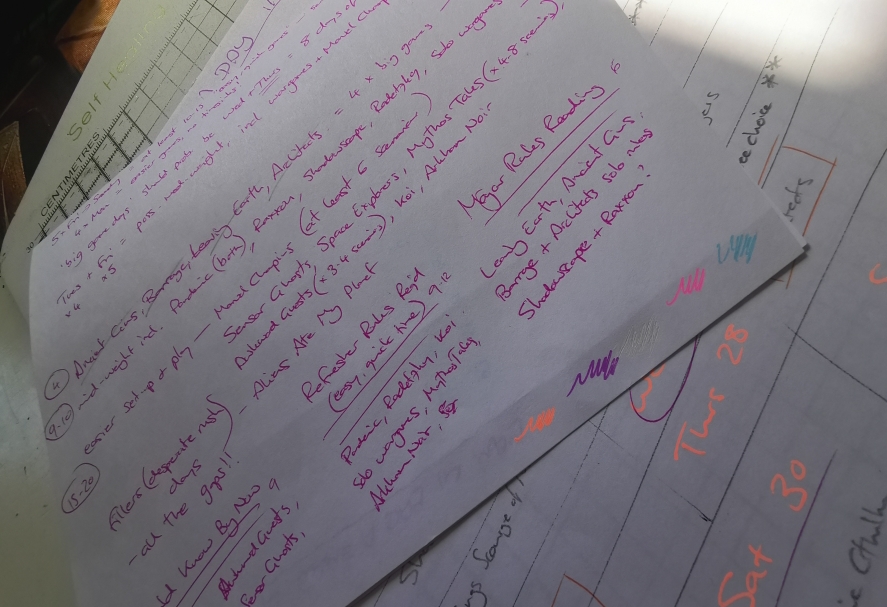 To cut a short story even shorter: wheels turned, thoughts came and went, and I had a bit of a crazy idea: let’s try and play at least one game every day in May, and because I’m still also working 5-6 nights a week (in a supermarket: not quite as heroic as those incredible NHS folks, alas), it might be something that needs a little planning… thus the scribbles in the main image above!