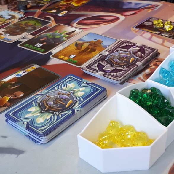 Century: Golem Edition is effectively a gorgeous re-skinned version of the original, using crystals instead of cubes, slightly different colours and coins, and special custom artwork tailored to each card… they really are something special, though, I think: