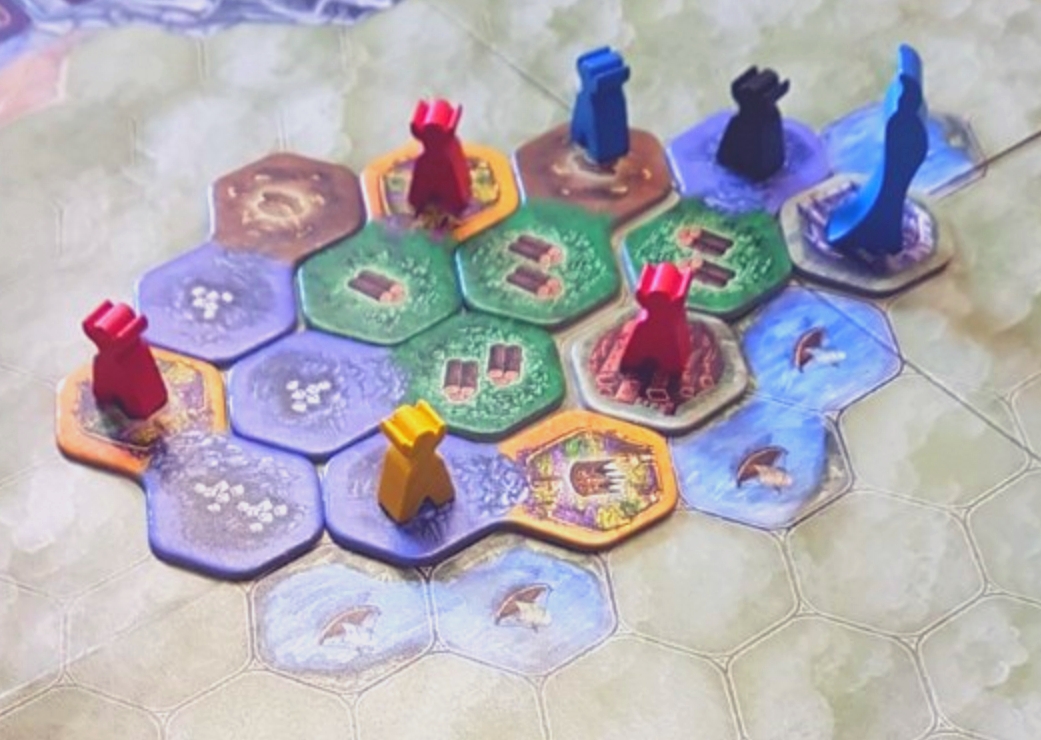 The clever part is in how the scoring works because when a particular terrain type is completely surrounded by other terrain types, that area gets scored. Often there’s more than one area getting ‘closed-off’ each turn, and players can score multiple times quite easily. Unfortunately, if you have meeples caught (or ‘captured’) in a closed area, those meeples are returned to you without scoring anything, and it’s the meeples on hexes adjacent to the closed-off areas that get all the points… And those meeples are not removed! It should be immediately obvious that where you place your meeples has real significance in this game, and the way the closed-off areas are scored is so off-the-wall and against every intuitive play you know from other games, that it does take quite a while to wrap your head around it. The strategic decision-making behind all this makes the game a bit of a brain-burner, and don’t be surprised if other players take great delight in cutting areas off before they become too valuable for somebody else.
